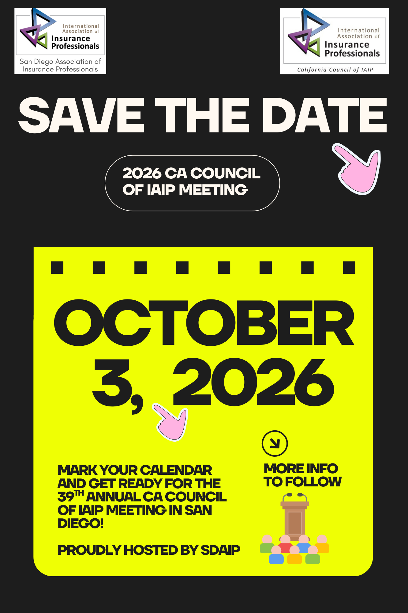2026 CA Council of IAIP meeting Saturday, October 3, 2026 8:00 AM 5:00 PM 08:00 17:00 San Diego (map) Google Calendar ICS